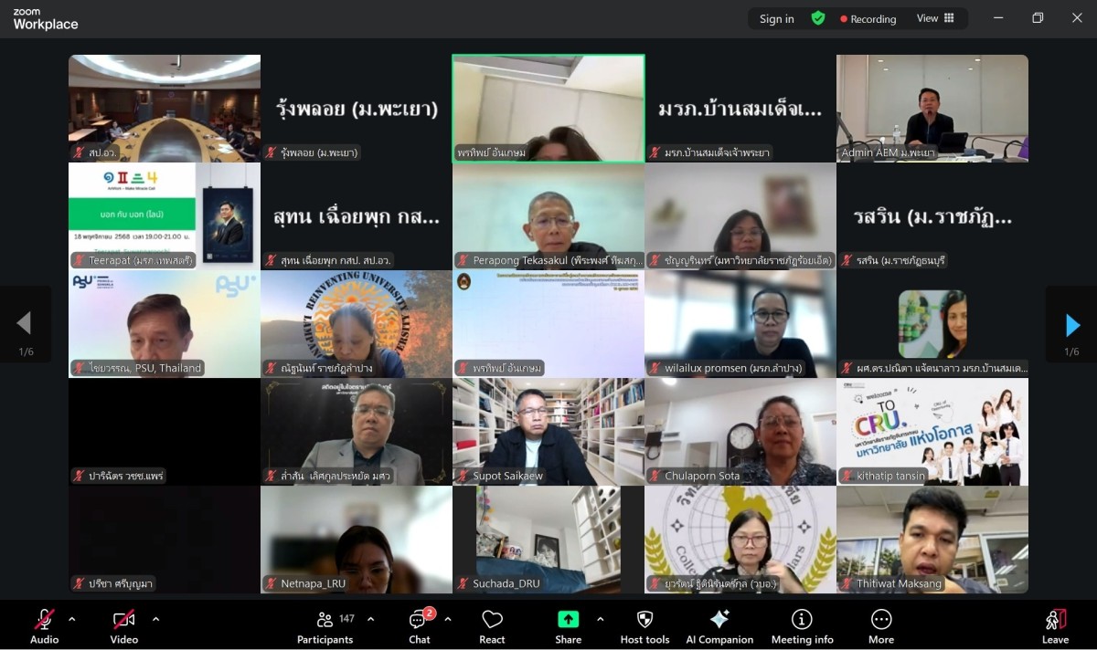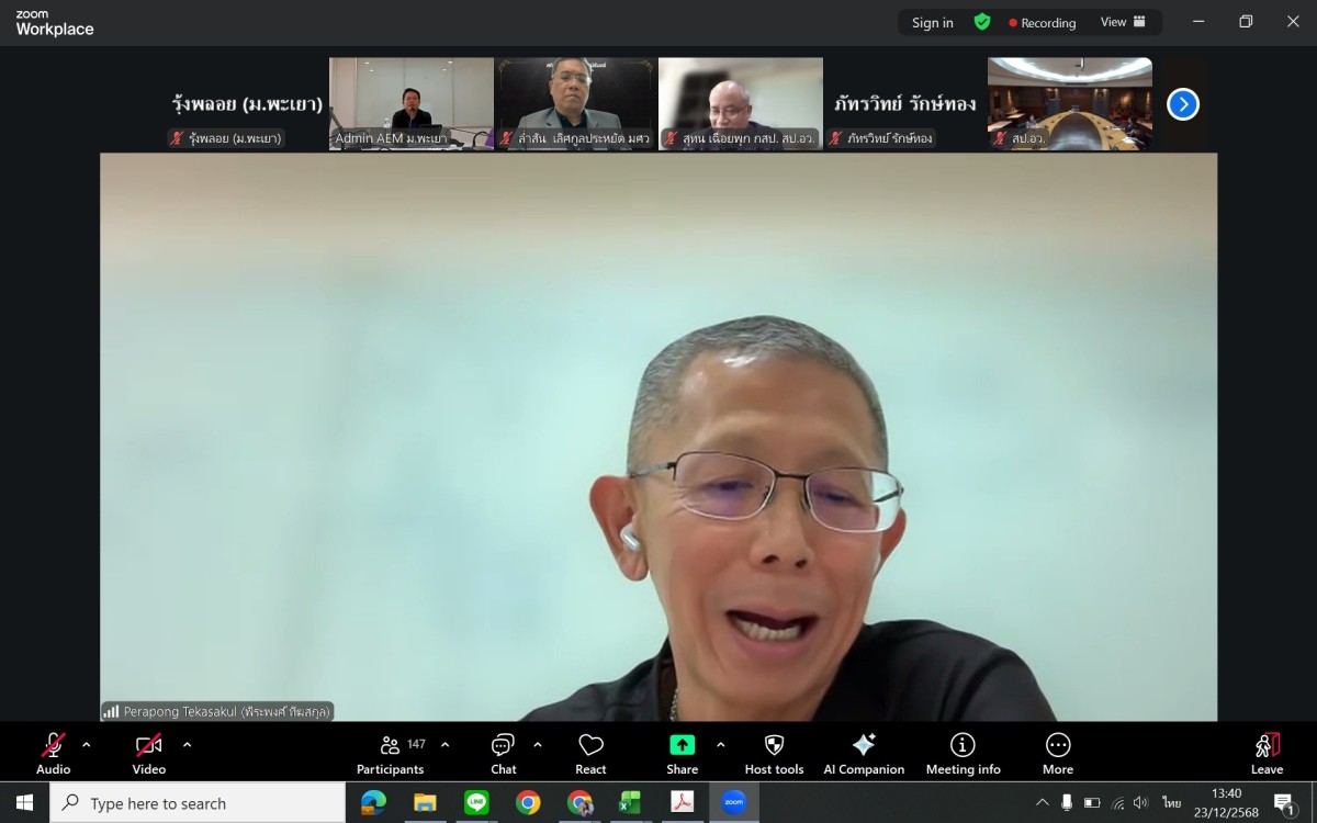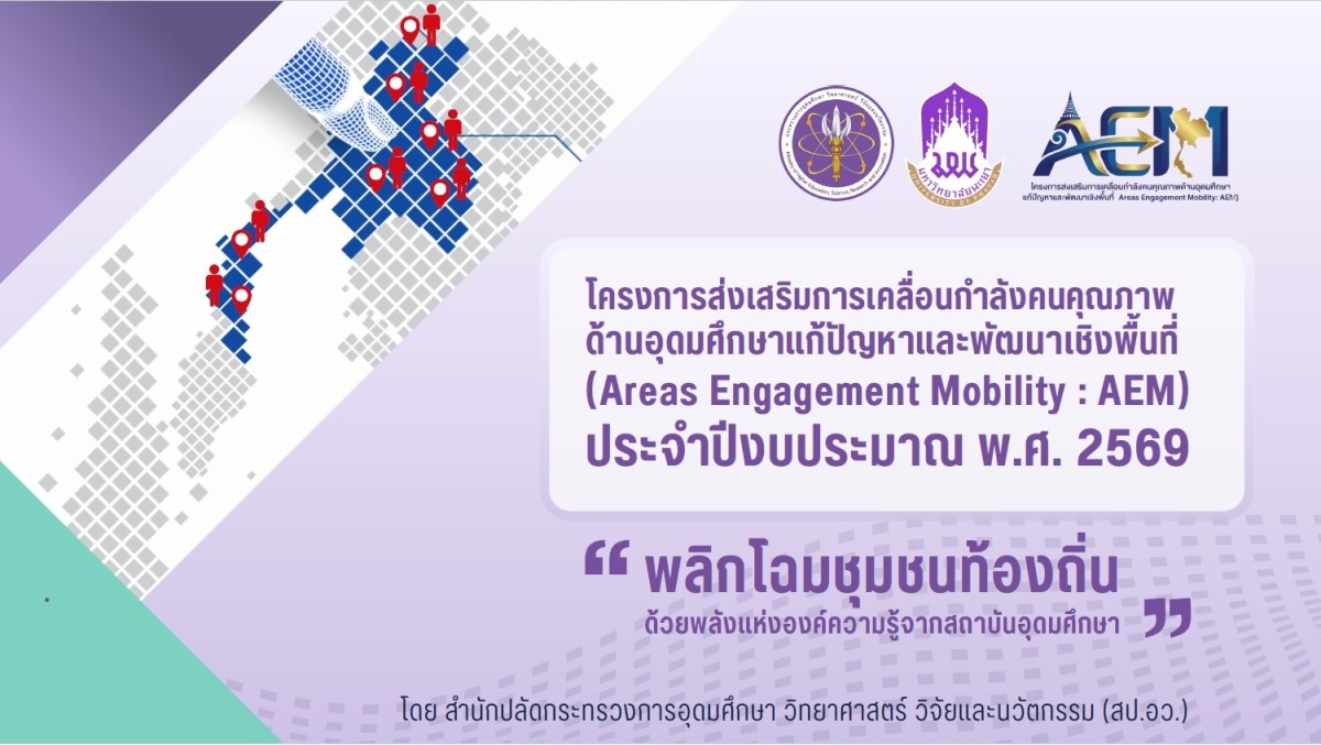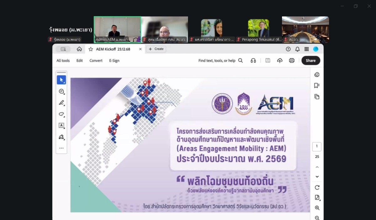 เมื่อวันที่ 23 ธันวาคม 2568 สำนักงานปลัดกระทรวงการอุดมศึกษา วิทยาศาสตร์ วิจัยและนวัตกรรม (สป.อว.) โดยนายสุทน เฉื่อยพุก ผู้อำนวยการกองส่งเสริมและพัฒนาทุนทางปัญญา ร่วมกับ มหาวิทยาลัยพะเยา นำโดย ศาสตราจารย์ ดร.เสมอ ถาน้อย รองอธิการบดีฝ่ายวิจัยและนวัตกรรม จัดประชุมชี้แจงแนวทางการดำเนินงานและรับข้อเสนอโครงการส่งเสริมการเคลื่อนกำลังคนคุณภาพด้านอุดมศึกษาแก้ปัญหาและพัฒนาเชิงพื้นที่ Areas Engagement Mobility (AEM) ประจำปี 2569 ผ่านระบบออนไลน์ เพื่อชี้แจง นโยบาย กรอบการทำงาน และขั้นตอนการส่งข้อเสนอโครงการ AEM แก่ผู้บริหารและบุคลากรในสังกัดสถาบัน มหาวิทยาลัยกลุ่ม 3 (มหาวิทยาลัยพัฒนาชุมชนท้องถิ่นหรือชุมชนอื่น)
