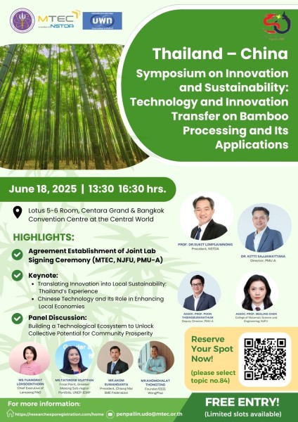- หัวข้อการประชุม 084 | การสัมมนาไทย–จีนด้านนวัตกรรมและความยั่งยืน: การถ่ายทอดเทคโนโลยีและนวัตกรรมการแปรรูปไม้ไผ่และการประยุกต์ใช้งาน