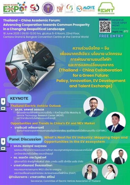 - หัวข้อการประชุม 072 | ความร่วมมือไทย–จีนเพื่ออนาคตสีเขียว: นโยบาย นวัตกรรม การพัฒนายานยนต์ไฟฟ้าและการแลกเปลี่ยนบุคลากร