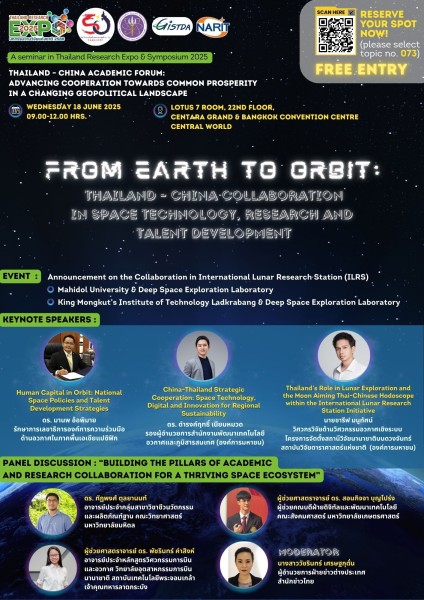 - หัวข้อการประชุม 073 | จากโลกสู่วงโคจร: ความร่วมมือไทย–จีน ด้านเทคโนโลยีอวกาศ การวิจัยและการพัฒนาบุคลากร