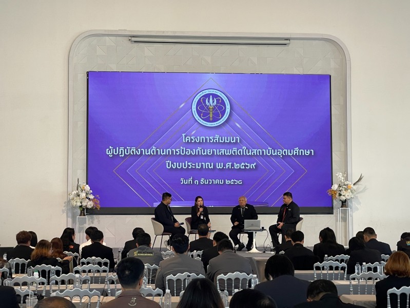 นายศุภโชค สุขมาก รักษาราชการแทนผู้อำนวยการกองส่งเสริมและพัฒนากำลังคน เป็นประธานกล่าวเปิดโครงการสัมมนาผู้ปฏิบัติงานด้านการป้องกันยาเสพติดในสถาบันอุดมศึกษา ปีงบประมาณ พ.ศ. 2569 และชี้แจงกรอบการดำเนินงาน เมื่อวันที่ 1 ธันวาคม 2568 ณ โรงแรมควีนส์แลนด์ กรุงเทพฯ โดยโครงการดังกล่าวมีวัตถุประสงค์เพื่อรับทราบสรุปผลการดำเนินงานโครงการสร้างภูมิคุ้มกันและป้องกันยาเสพติดในสถาบันอุดมศึกษา ปีงบประมาณ พ.ศ. 2568 ของเครือข่ายเพื่อการพัฒนาอุดมศึกษา 9 เครือข่าย และเสริมสร้างความรู้ ความเข้าใจ แนวปฏิบัติ และทักษะที่จำเป็นด้านการป้องกันยาเสพติดให้แก่บุคลากรผู้ปฏิบัติงานด้านการป้องกันยาเสพติดในสถาบันอุดมศึกษา มีบุคลากรผู้ปฏิบัติงานด้านการป้องกันและแก้ไขปัญหายาเสพติดในสถาบันอุดมศึกษาเข้าร่วมโครงการ กว่า 280 คน